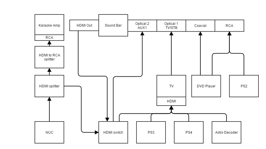 (Had this drafted months ago, but thought it would be pointless. Recently though, my sound bar / AVR somehow reset all its settings and I had to figure out how the wiring goes again. After sorting everything out, I thought I should make a record just in case I forget again :P)